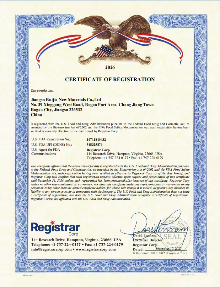 江苏瑞佳新材料有限公司(原江苏瑞晨化学有限公司),成立于2009年,公司位于江苏省如皋市沿江开发区,公司占地97亩,注册资金共4800万元人民币,总投资达到2亿元人民币,一期项目于2011年顺利投产,二期项目于2013年投产,三期项目于2017年投产,目前主要产品包括三乙酸甘油酯、乙酸正丙酯等环保型溶剂、高性能负载型催化剂等,生产能力达3万吨每年。公司产品主要应用于烟草、食品、香精香料、铸造、涂料、油墨、医药、PTA、生物塑料等领域。公司是国家高新技术企业(2017年)、江苏省“专精特新”中小企业(2023年)、安全二级标准化企业、环保绿色企业;公司通过ISO9001、ISO14001、ISO22000等体系认证。