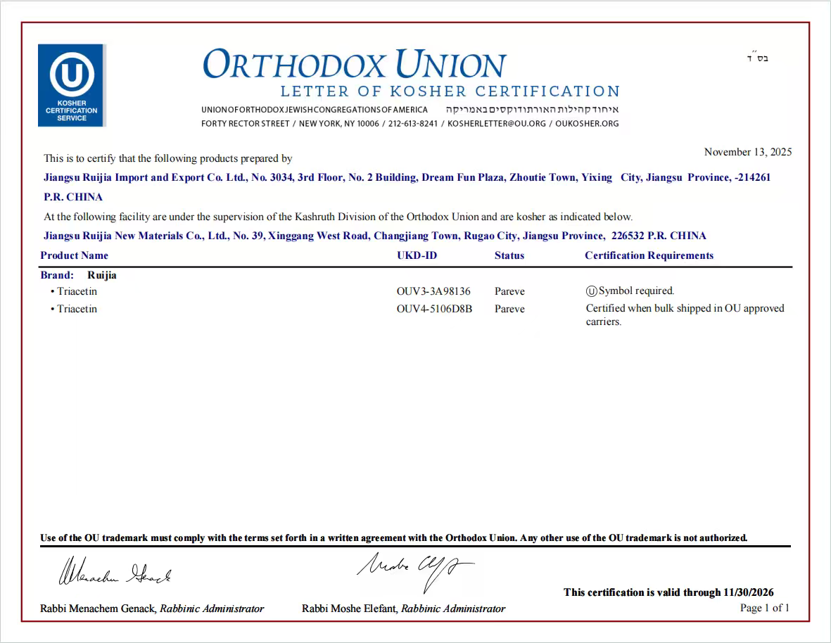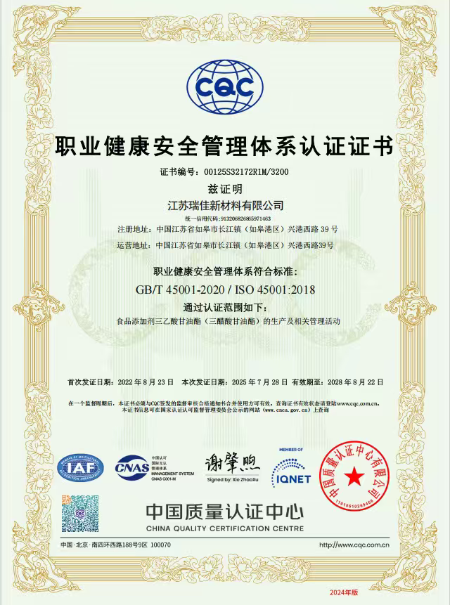 公司秉承“以质为本,以诚取信”的经营理念,具有完善的质量、环境、安全体系,通过ISO9001、ISO14001、ISO22000等体系认证。主要出口产品三乙酸甘油酯通过KOSHER、HALAL认证,完成了FDA和REACH的正式注册。