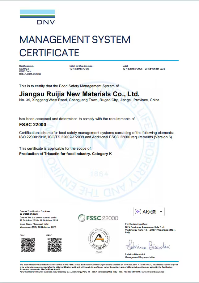 Passed ISO9001, ISO14001, ISO22000 and other system certifications. The main export product, triacetin, has passed KOSHER and HALAL certification